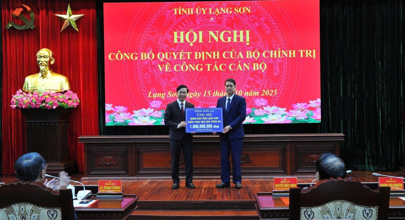 Tỉnh Sơn La trao kinh phí hỗ trợ tỉnh Lạng Sơn khắc phục hậu quả do các cơn bão gây ra