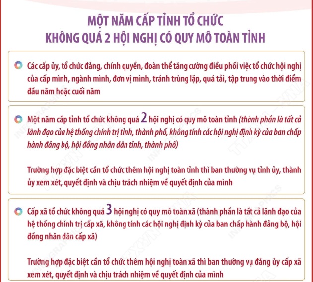 - Các cấp uỷ, tổ chức đảng, chính quyền, đoàn thể tăng cường điều phối việc tổ chức hội nghị của cấp mình, ngành mình, đơn vị mình, tránh trùng lặp, quá tải, tập trung vào thời điểm đầu năm hoặc cuối năm; Một năm cấp tỉnh tổ chức không quá 2 hội nghị có quy mô toàn tỉnh (thành phần là tất cả lãnh đạo của hệ thống chính trị tỉnh, thành phố, không tính các hội nghị định kỳ của ban chấp hành đảng bộ, hội đồng nhân dân tỉnh, thành phố), trường hợp đặc biệt cần tổ chức thêm hội nghị toàn tỉnh thì ban thường vụ tỉnh uỷ, thành uỷ xem xét, quyết định và chịu trách nhiệm về quyết định của mình; Cấp xã tổ chức không quá 3 hội nghị có quy mô toàn xã (thành phần là tất cả lãnh đạo của hệ thống chính trị cấp xã, không tính các hội nghị định kỳ của ban chấp hành đảng bộ, hội đồng nhân dân cấp xã), trường hợp đặc biệt cần tổ chức thêm hội nghị toàn xã thì ban thường vụ đảng uỷ cấp xã xem xét, quyết định và chịu trách nhiệm về quyết định của mình.