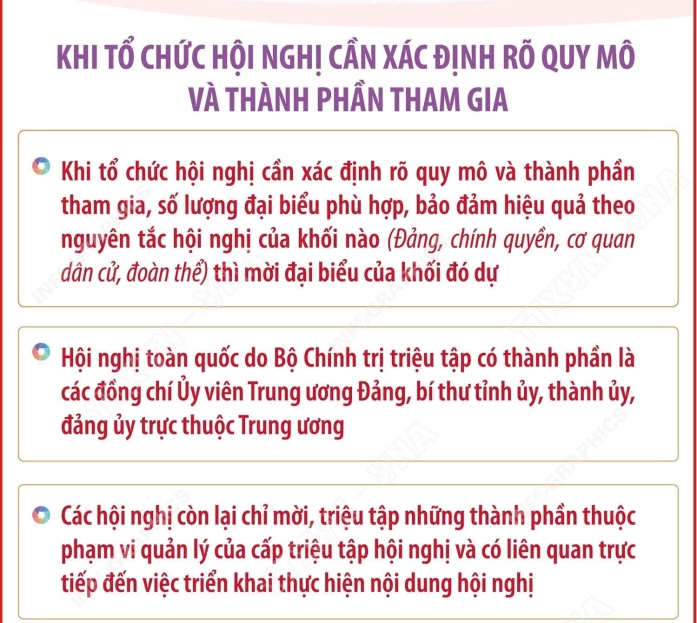 - Khi tổ chức hội nghị cần xác định rõ quy mô và thành phần tham gia, số lượng đại biểu phù hợp, bảo đảm hiệu quả theo nguyên tắc hội nghị của khối nào (Đảng, chính quyền, cơ quan dân cử, đoàn thể) thì mời đại biểu của khối đó dự.