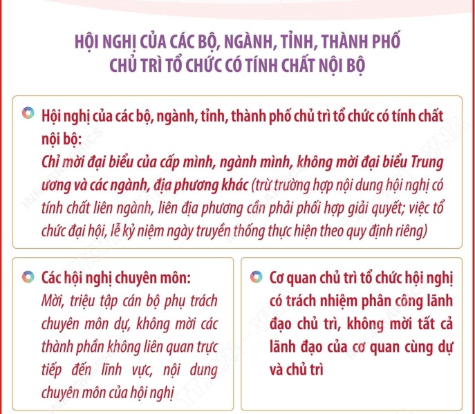 Các hội nghị chuyên môn: Mời, triệu tập cán bộ phụ trách chuyên môn dự, không mời các thành phần không liên quan trực tiếp đến lĩnh vực, nội dung chuyên môn của hội nghị. Cơ quan chủ trì tổ chức hội nghị có trách nhiệm phân công lãnh đạo chủ trì, không mời tất cả lãnh đạo của cơ quan cùng dự và chủ trì.