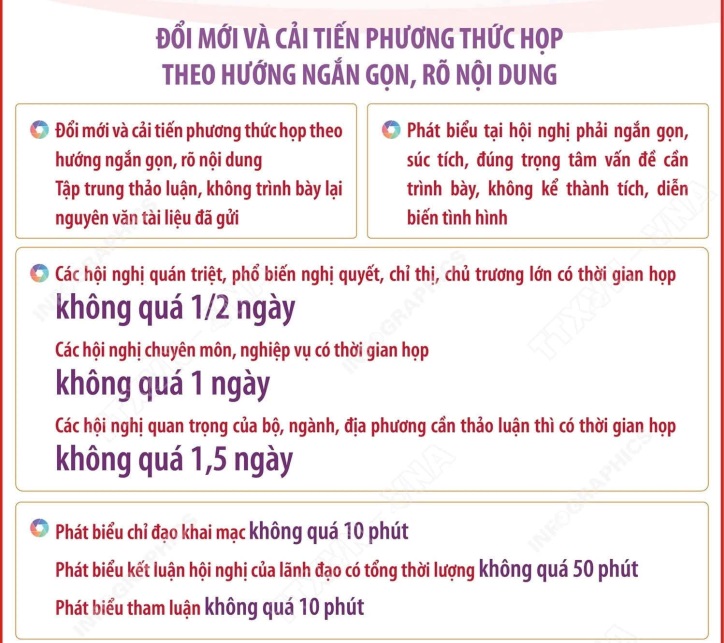 - Đổi mới và cải tiến phương thức họp theo hướng ngắn gọn, rõ nội dung; tập trung thảo luận, không trình bày lại nguyên văn tài liệu đã gửi. Các hội nghị quán triệt, phổ biến nghị quyết, chỉ thị, chủ trương lớn có thời gian họp không quá 1/2 ngày; các hội nghị chuyên môn, nghiệp vụ có thời gian họp không quá 1 ngày; các hội nghị quan trọng của bộ, ngành, địa phương cần thảo luận thì có thời gian họp không quá 1,5 ngày.
