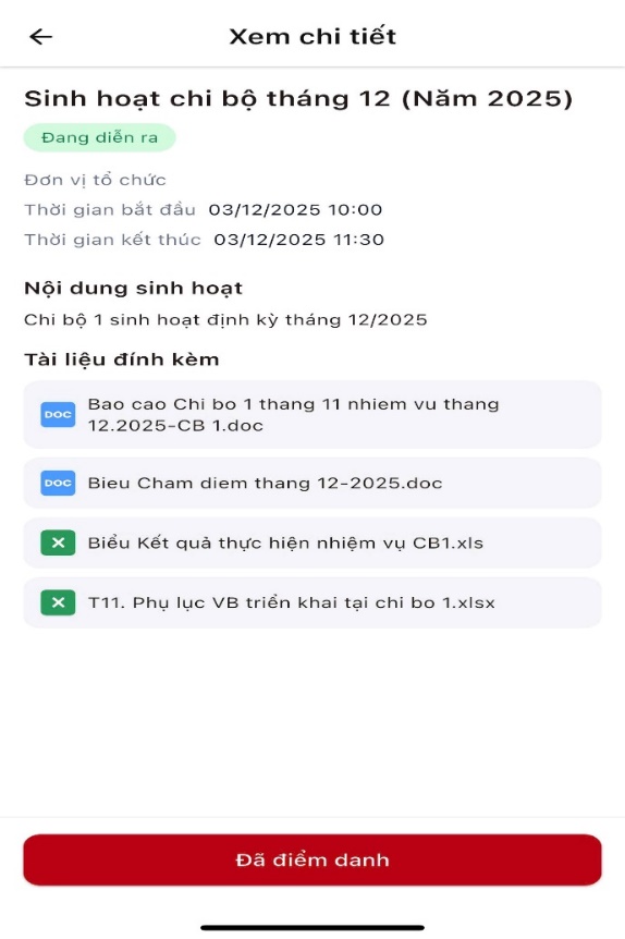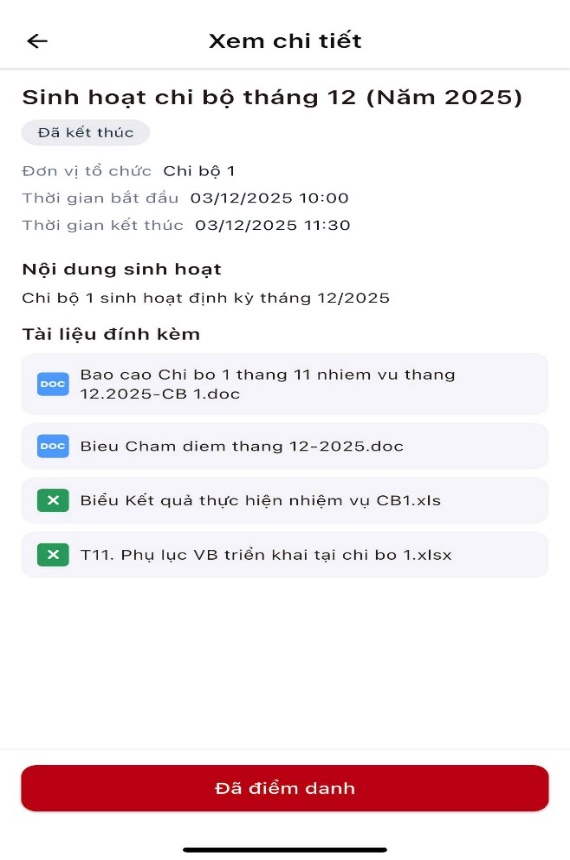 Ảnh: Màn hình hiển thị thông tin buổi sinh hoạt chi bộ tháng 12/2025 của Chi bộ 1 đang diễn ra và đã kết thúc.