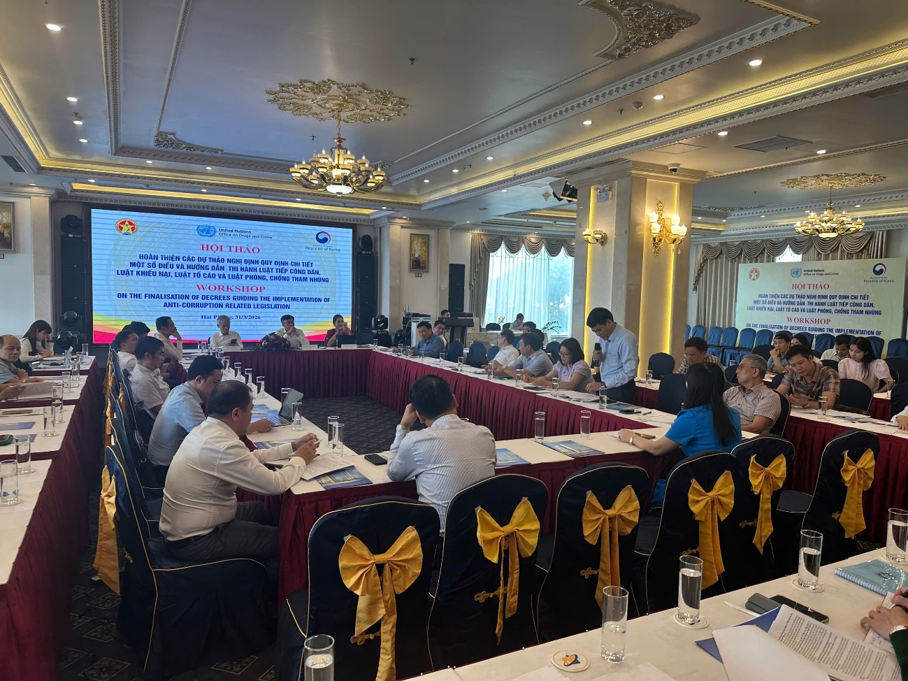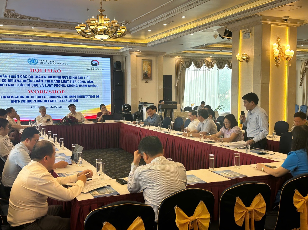 Ngày 31/3/2026, Thanh tra Chính phủ phối hợp với Cơ quan Phòng, chống ma túy và tội phạm Liên hợp quốc (UNODC) tại Việt Nam tổ chức Hội thảo hoàn thiện các dự thảo Nghị định quy định chi tiết một số điều và hướng dẫn thi hành Luật Tiếp công dân, Luật Khiếu nại, Luật Tố cáo và Luật Phòng, chống tham nhũng. Sự kiện có sự tham gia của đại diện các bộ, ngành Trung ương, các đơn vị thuộc Thanh tra Chính phủ và thanh tra một số địa phương phía Bắc, nhằm trao đổi, đánh giá và kiến nghị các nội dung để nâng cao hiệu lực, hiệu quả của hệ thống pháp luật liên quan.