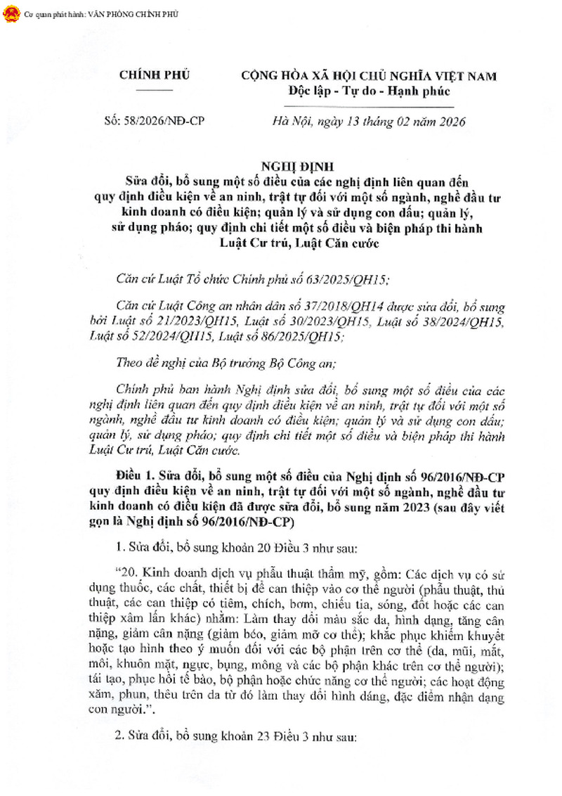 | Tiêu đề văn bản | Nghị định Sửa đổi, bổ sung một số điều của các nghị định liên quan đến quy định điều kiện về an ninh, trật tự đối với một số ngành, nghề đầu tư kinh doanh có điều kiện; quản lý và sử dụng con dấu; quản lý, sử dụng pháo; quy định chi tiết một số điều và biện pháp thi hành Luật Cư trú, Luật Căn cước | ||