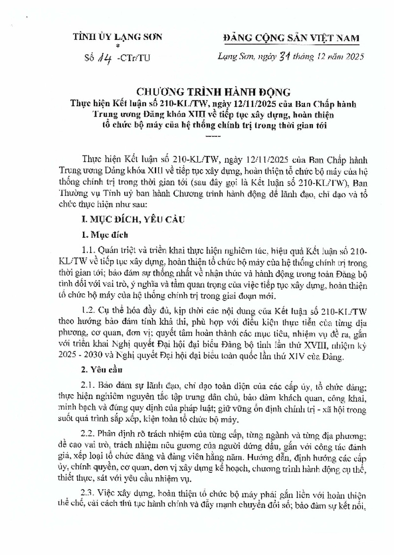 | Tiêu đề văn bản | Chương trình hành động thực hiện Kết luận số 210-KL/TW ngày 12/11/2025 của Ban Chấp hành Trung ương Đảng khóa XIII về tiếp tục xây dựng, hoàn thiện tổ chức bộ máy của hệ thống chính trị trong thời gian tới | ||