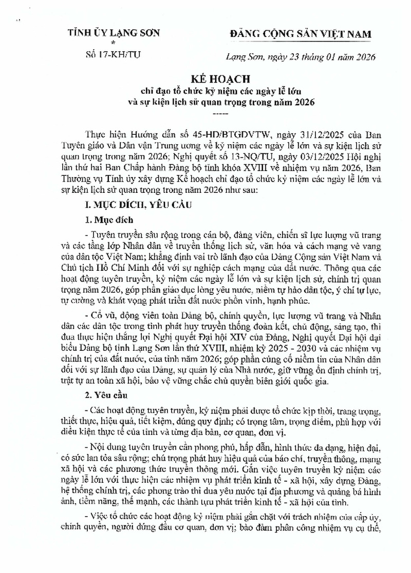 | Tiêu đề văn bản | Kế hoạch chỉ đạo tổ chức kỷ niệm các ngày lễ lớn và sự kiện lịch sử quan trọng trong năm 2026 | ||
