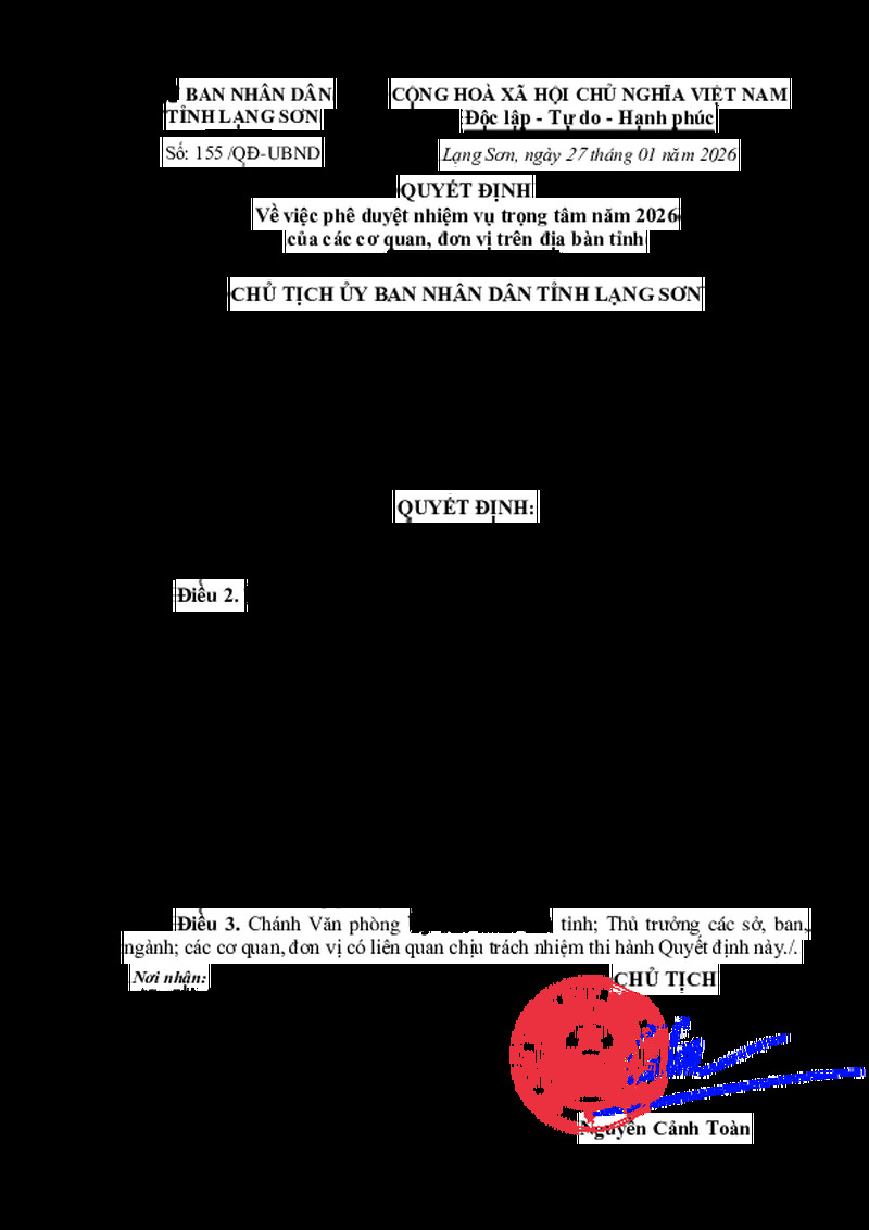 | Tiêu đề văn bản | Quyết định về việc phê duyệt nhiệm vụ trọng tâm năm 2026 của các cơ quan, đơn vị trên địa bàn tỉnh | ||