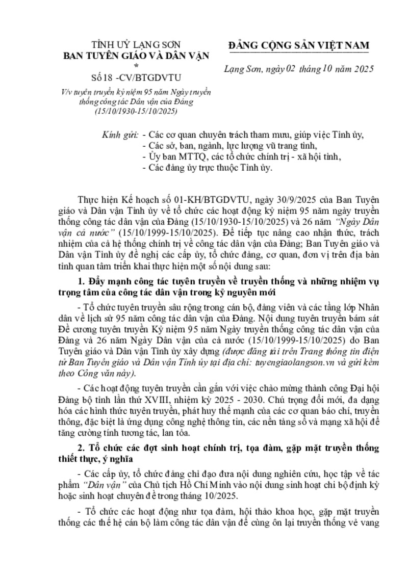 Tiêu đề văn bản | Về việc tuyên truyền kỷ niệm 95 năm Ngày truyền thống công tác Dân vận của Đảng (15/10/1930-15/10/2025) | ||