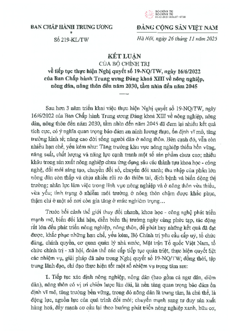 | Tiêu đề văn bản | Kết luận của Bộ Chính trị về tiếp tục thực hiện Nghị quyết số 19-NQ/TW ngày 16/06/2022 của Ban Chấp hành Trung ương Đảng khóa XIII về nông nghiệp, nông dân, nông thôn đến năm 2030, tầm nhìn đến năm 2045 | ||