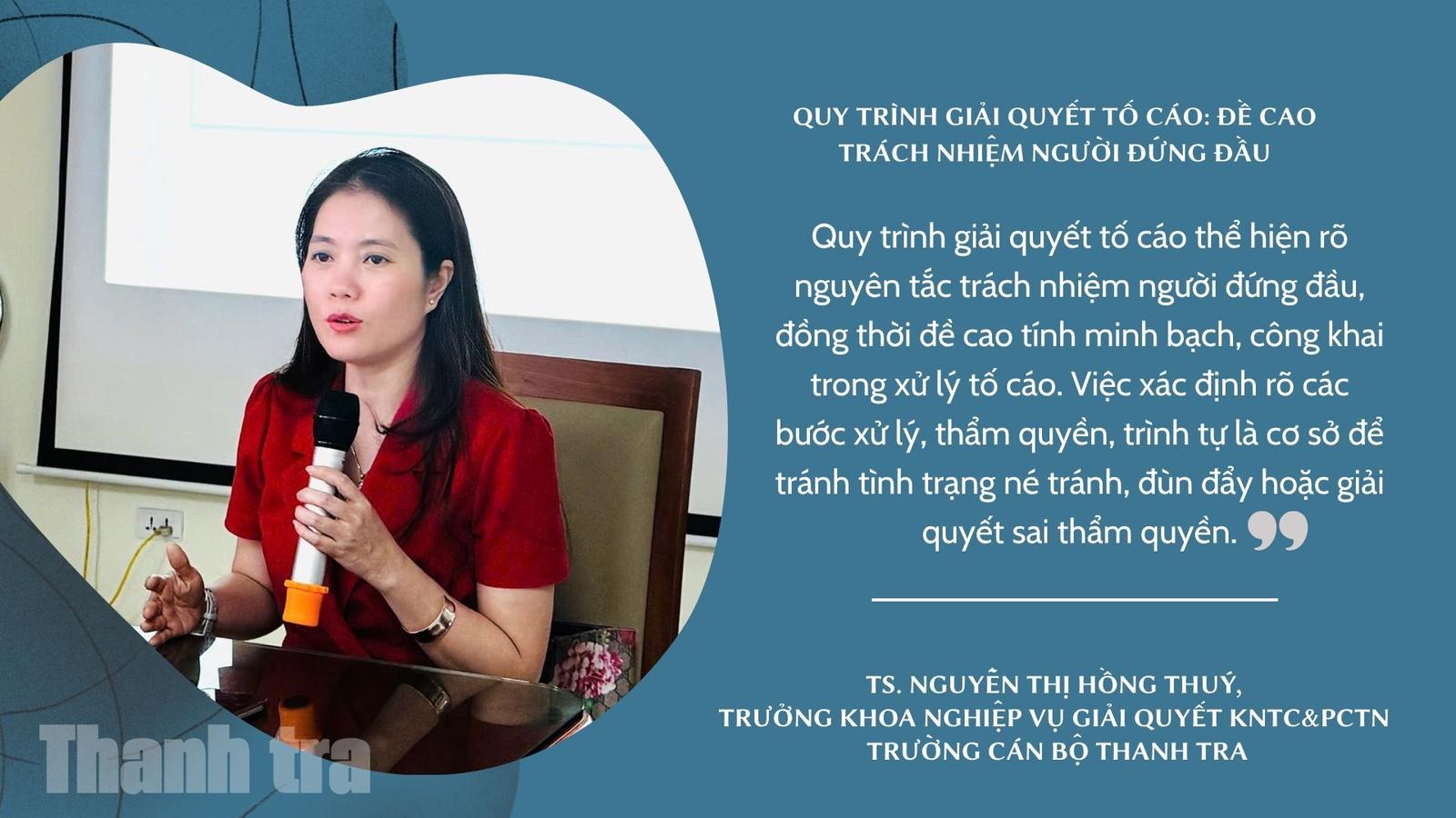 “Quy trình này thể hiện rõ nguyên tắc trách nhiệm người đứng đầu, đồng thời đề cao tính minh bạch, công khai trong xử lý tố cáo. Việc xác định rõ các bước xử lý, thẩm quyền, trình tự là cơ sở để tránh tình trạng né tránh, đùn đẩy hoặc giải quyết sai thẩm quyền”, TS. Nguyễn Thị Hồng Thuý nhấn mạnh.