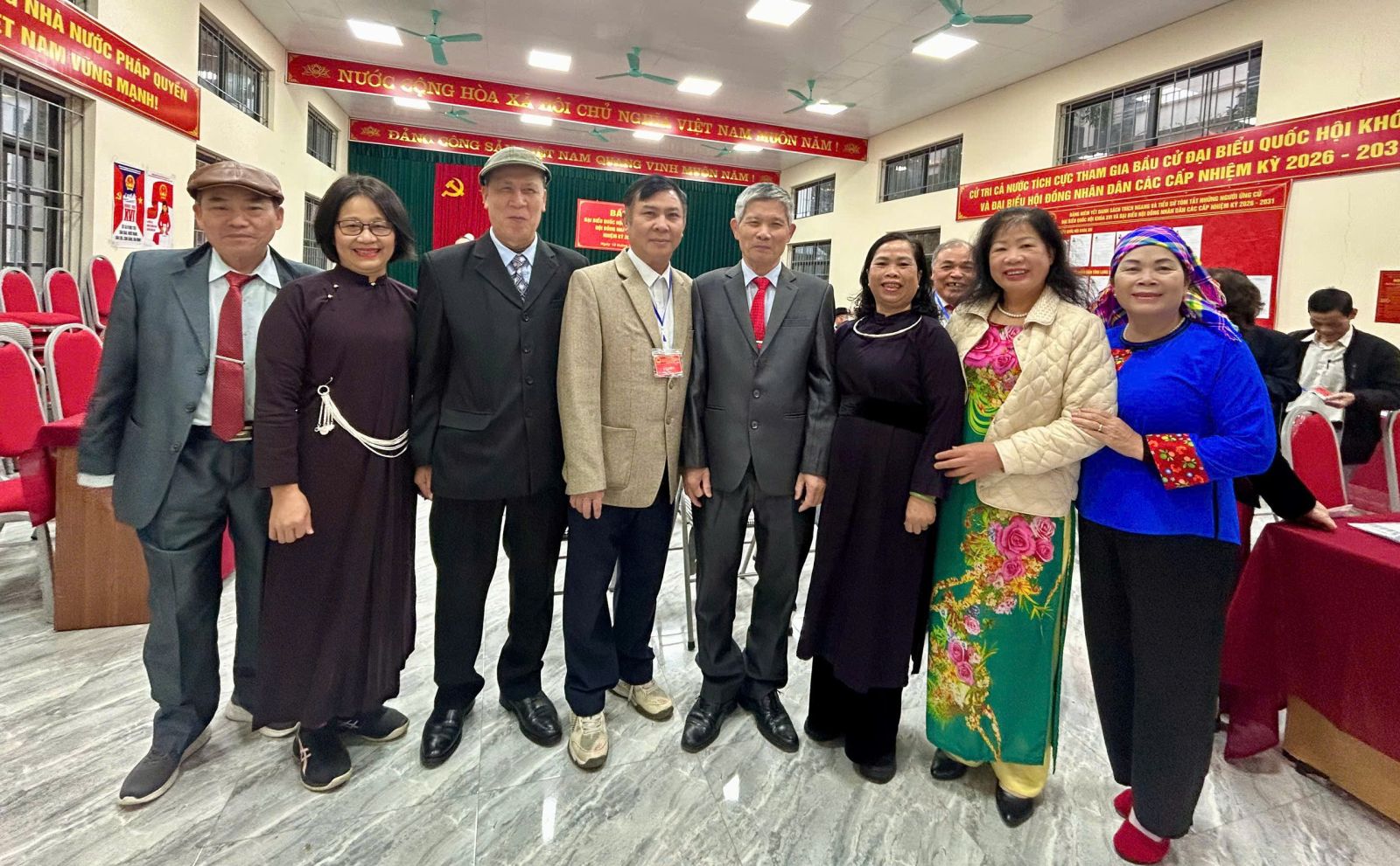 Đồng chí Nguyễn Mai Loan, Phó Chánh Thanh tra tỉnh hân hoan đi bầu cử cùng các cử tri là người dân tộc thiểu số và người cao tuổi tại điểm bầu cử.