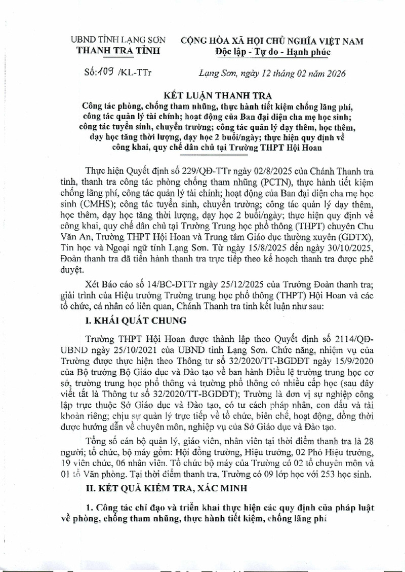 | Tiêu đề văn bản | Kết luận thanh tra công tác PCTN, thực hành tiết kiệm chống lãng phí, công tác quản lý tài chính; hoạt động của Ban đại diện CMHS; công tác tuyển sinh, chuyển trường; công tác quản lý dạy thêm, học thêm, dạy học tăng thời lượng, dạy học 2 buổi/ngày; thực hiện quy định về công khai, quy chế dân chủ tại Trường THPT Hội Hoan | ||