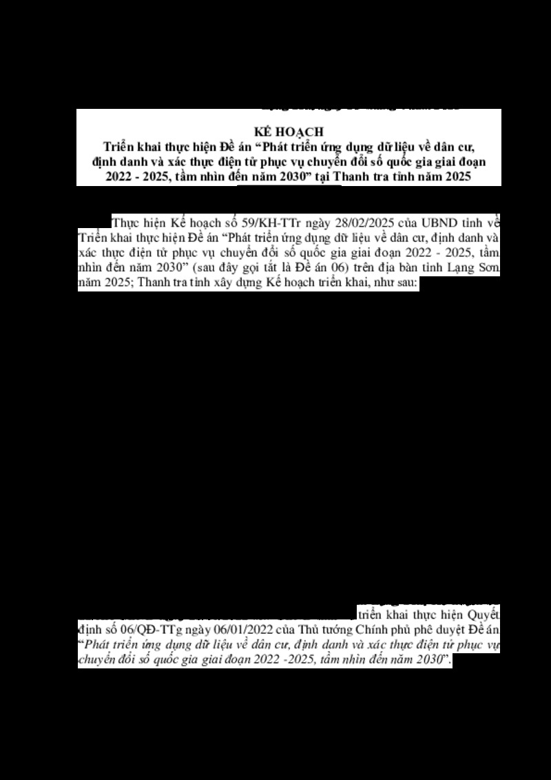 | Tiêu đề văn bản | Kế hoạch Triển khai thực hiện Đề án “Phát triển ứng dụng dữ liệu về dân cư, định danh và xác thực điện tử phục vụ chuyển đổi số quốc gia giai đoạn 2022 - 2025, tầm nhìn đến năm 2030” tại Thanh tra tỉnh năm 2025 | ||