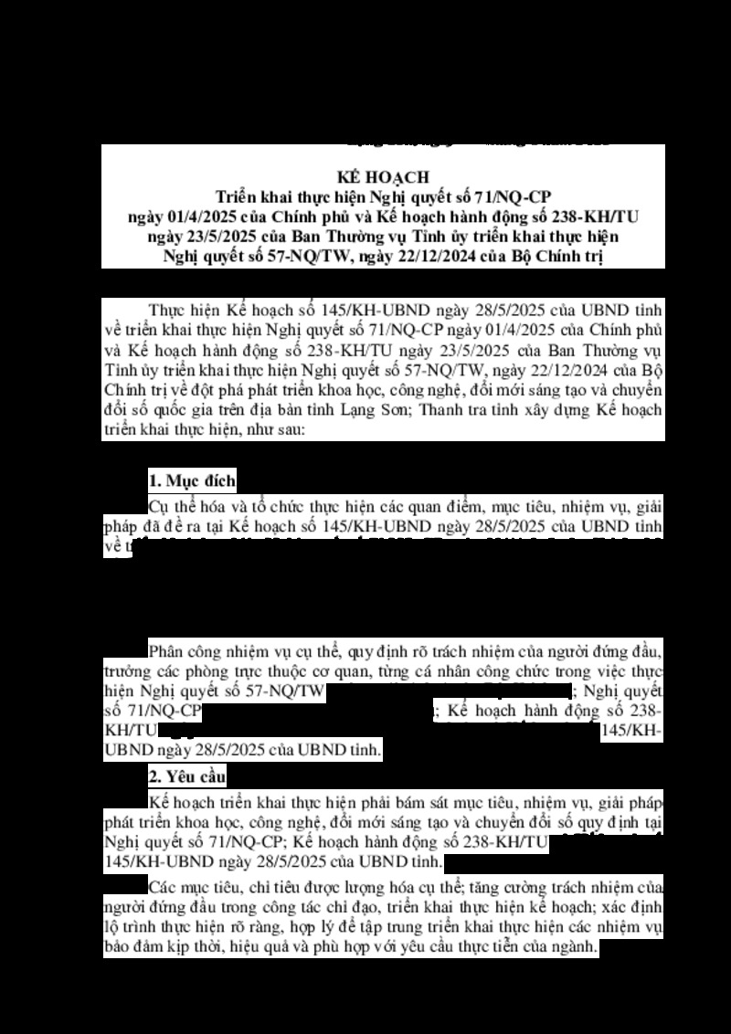 | Tiêu đề văn bản | Kế hoạch Triển khai thực hiện Nghị quyết số 71/NQ-CP ngày 01/4/2025 của Chính phủ và Kế hoạch hành động số 238-KH/TU ngày 23/5/2025 của Ban Thường vụ Tỉnh ủy triển khai thực hiện Nghị quyết số 57-NQ/TW, ngày 22/12/2024 của Bộ Chính trị về đột phá phát triển khoa học, công nghệ, đổi mới sáng tạo và chuyển đổi số quốc gia tại Thanh tra tỉnh | ||