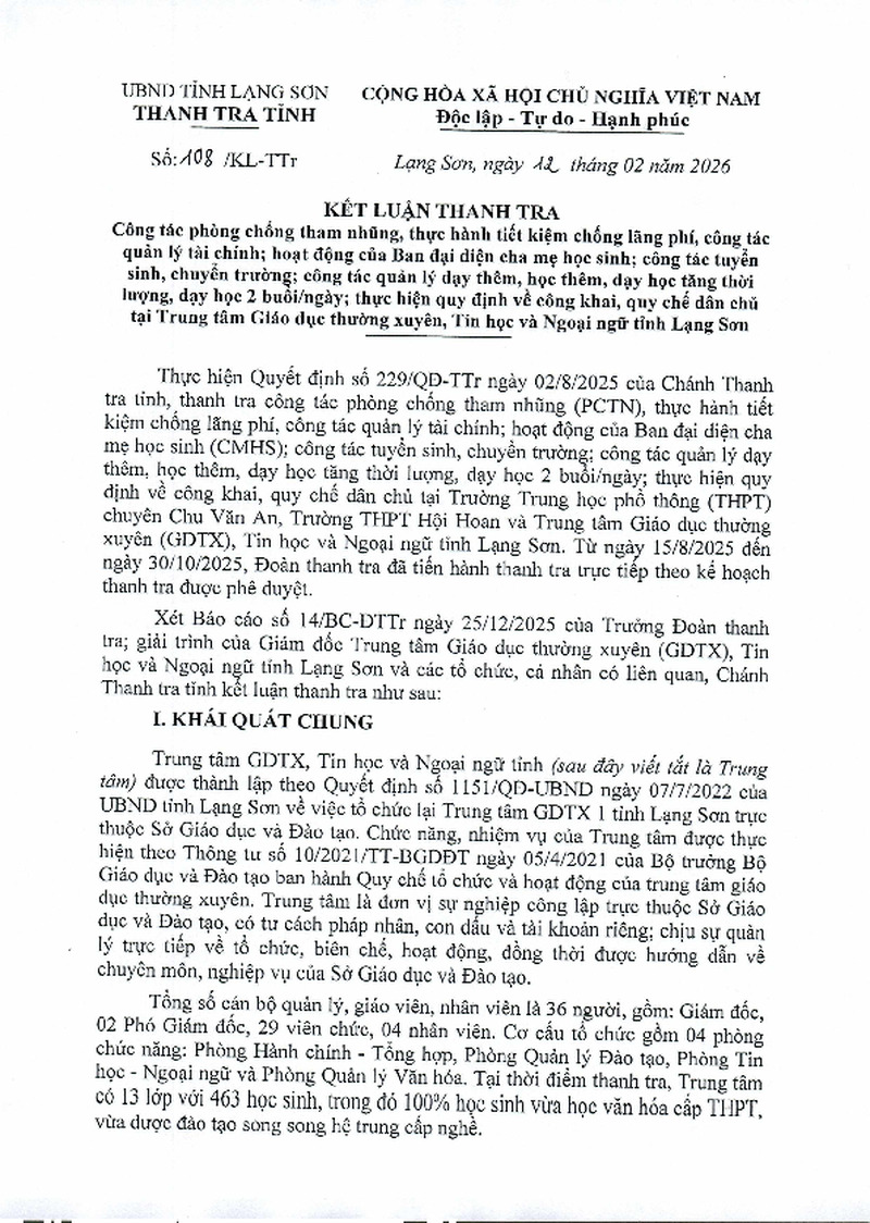 | Tiêu đề văn bản | Kết luận thanh tra công tác phòng chống tham nhũng, thực hành tiết kiệm chống lãng phí, công tác quản lý tài chính; hoạt động của Ban đại diện cha mẹ học sinh; công tác tuyển sinh, chuyển trường; công tác quản lý dạy thêm, học thêm, dạy học tăng thời lượng, dạy học 2 buổi/ngày; thực hiện quy định về công khai, quy chế dân chủ tại Trung tâm Giáo dục thường xuyên, Tin học và Ngoại ngữ tỉnh Lạng Sơn | ||