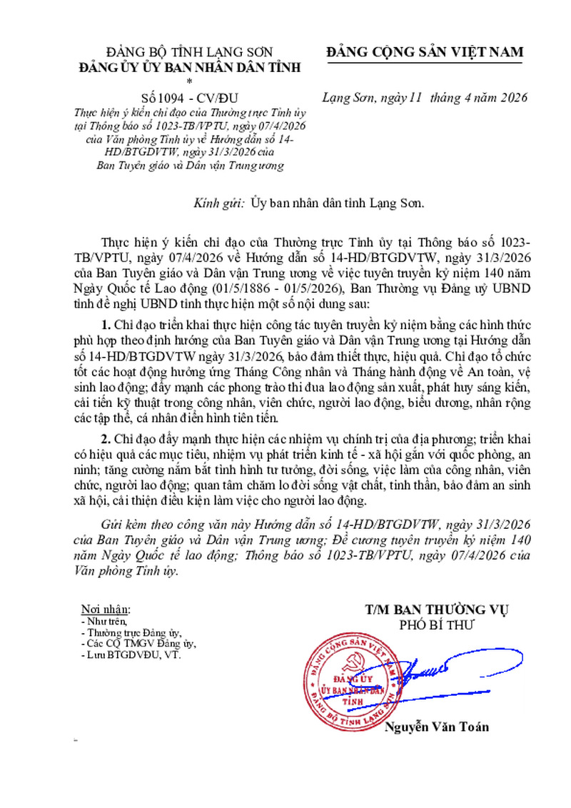 | Tiêu đề văn bản | Công văn số 1094/CV-ĐU ngày 11/4/2026 của Đảng ủy ủy ban nhân dân tỉnh thực hiện ý kiến chỉ đạo của Thường trực Tỉnh ủy tại Thông báo số 1023-TB/VPTU, ngày 07/4/2026 của Văn phòng Tỉnh ủy về Hướng dẫn số 14- HD/BTGDVTW, ngày 31/3/2026 của Ban Tuyên giáo và Dân vận Trung ương | ||