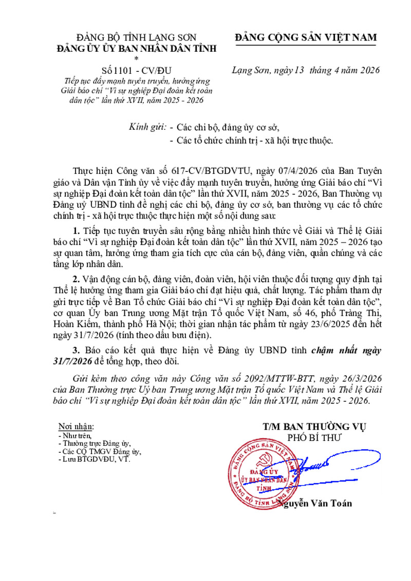 | Tiêu đề văn bản | Công văn số 1101-CV/ĐU ngày 13/4/2026 của Đảng uỷ UBND tỉnh tiếp tục đẩy mạnh tuyên truyền, hưởng ứng Giải báo chí “Vì sự nghiệp Đại đoàn kết toàn dân tộc” lần thứ XVII, năm 2025 - 2026 | ||