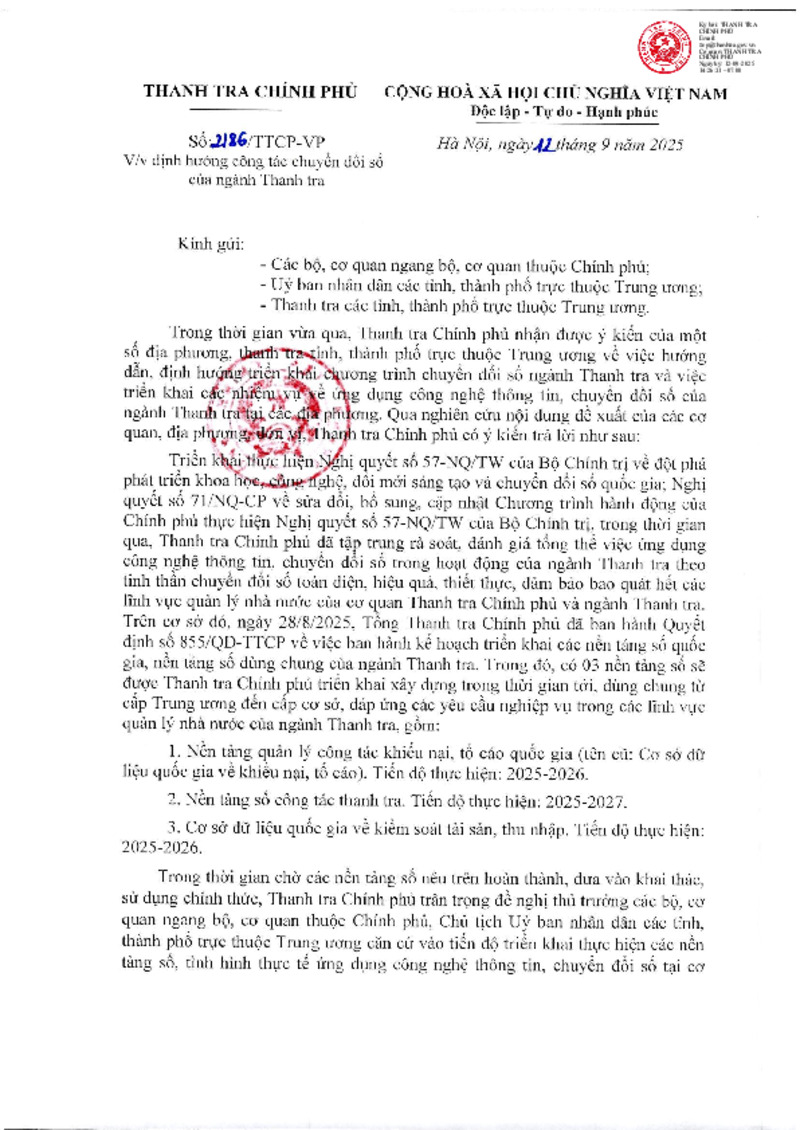 Tiêu đề văn bản | V/v Định hướng công tác chuyển đổi số của ngành Thanh tra | ||